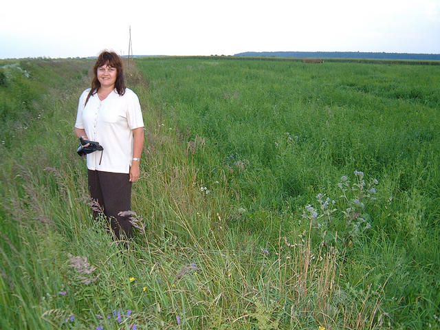 We made our escape across the bridge, and I would not advise anyone to try and drive over it again! We headed back to Lygumai and our plan was to go around to the other side of the Deliverance-man's house in the thicket to see if we could reach the confluence from there. We drove north through Pamusis and soon thereafter turned south-east on the road towards Pakruojis. Things were looking good � we were about three kilometres from the confluence, and on this heading, we would drive straight into it! We then got to the opposite side of the Wild Man's field and the GPS directed us to the green field across the road from his � the confluence was just a few hundred metres away. As luck would have it, a tractor path between two fields took us to within 25 metres of the confluence that we eventually found with relative ease (on the crest of an irrigation ditch) at about 20h00! A woman rode past on her bicycle with a pail on the back, and proceeded to milk the cow standing about 50 metres beyond us. I hoped it was not the wife of the Thicket Man!!